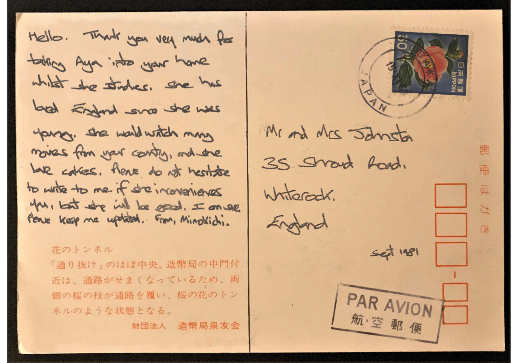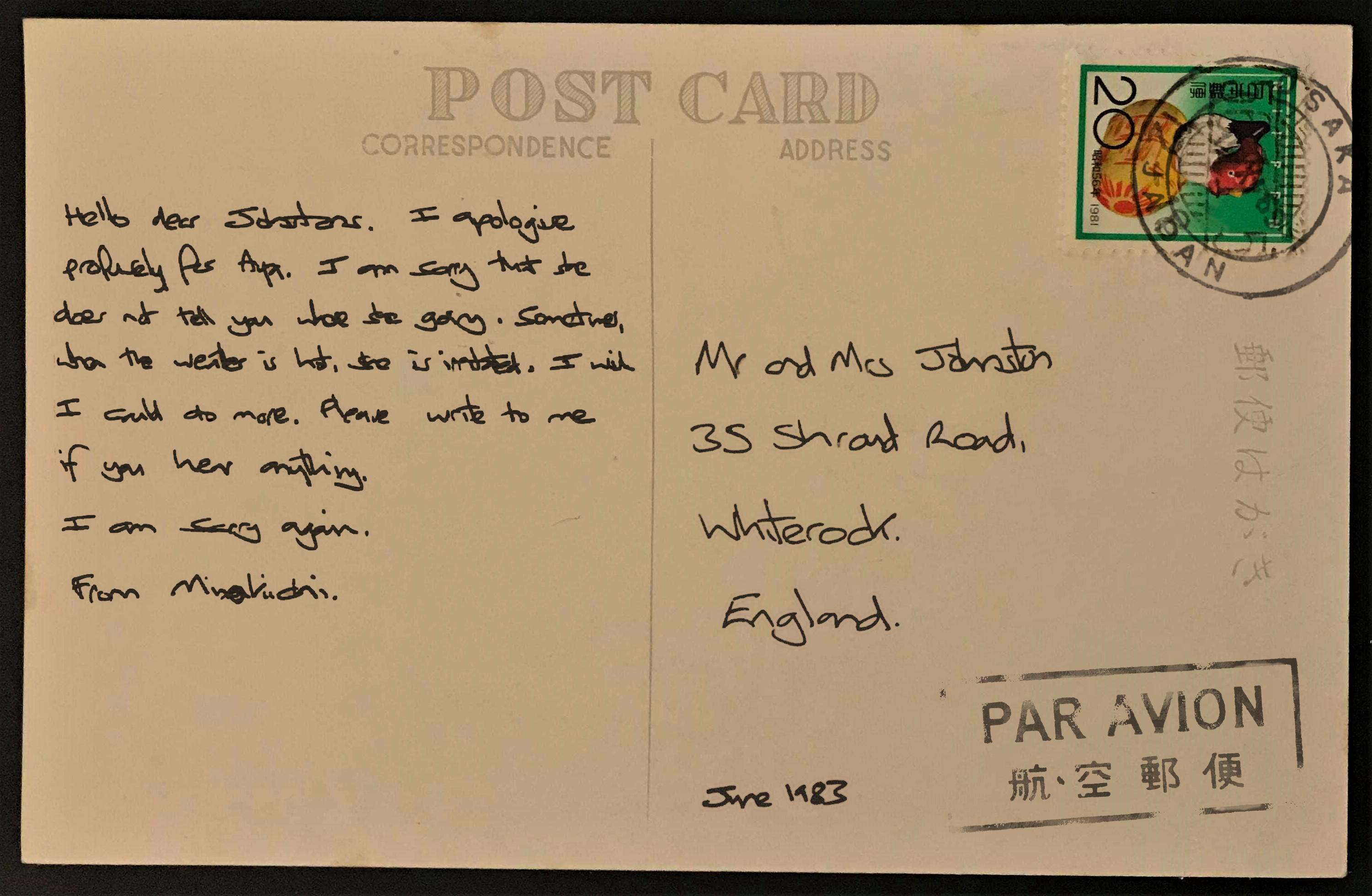 Yesterday, I made my usual visit to the local charity shop. One of the workers who knows me there gave me a postcard that must have fallen out from the Japanese set. After interviewing Aya, the subject of the postcards, I was under the impression that she had parted ways with her host family amicably. However, this new postcard would suggest otherwise. I know this perhaps seems like a trivial detail, but I feel that I have failed to convey the full story. Additionally, though I believed myself to have misunderstood the situation, when I emailed Aya to clear things up, she was not receptive. At the request of some of my readers, I have continued to investigate the story with the Johnston’s son, David.