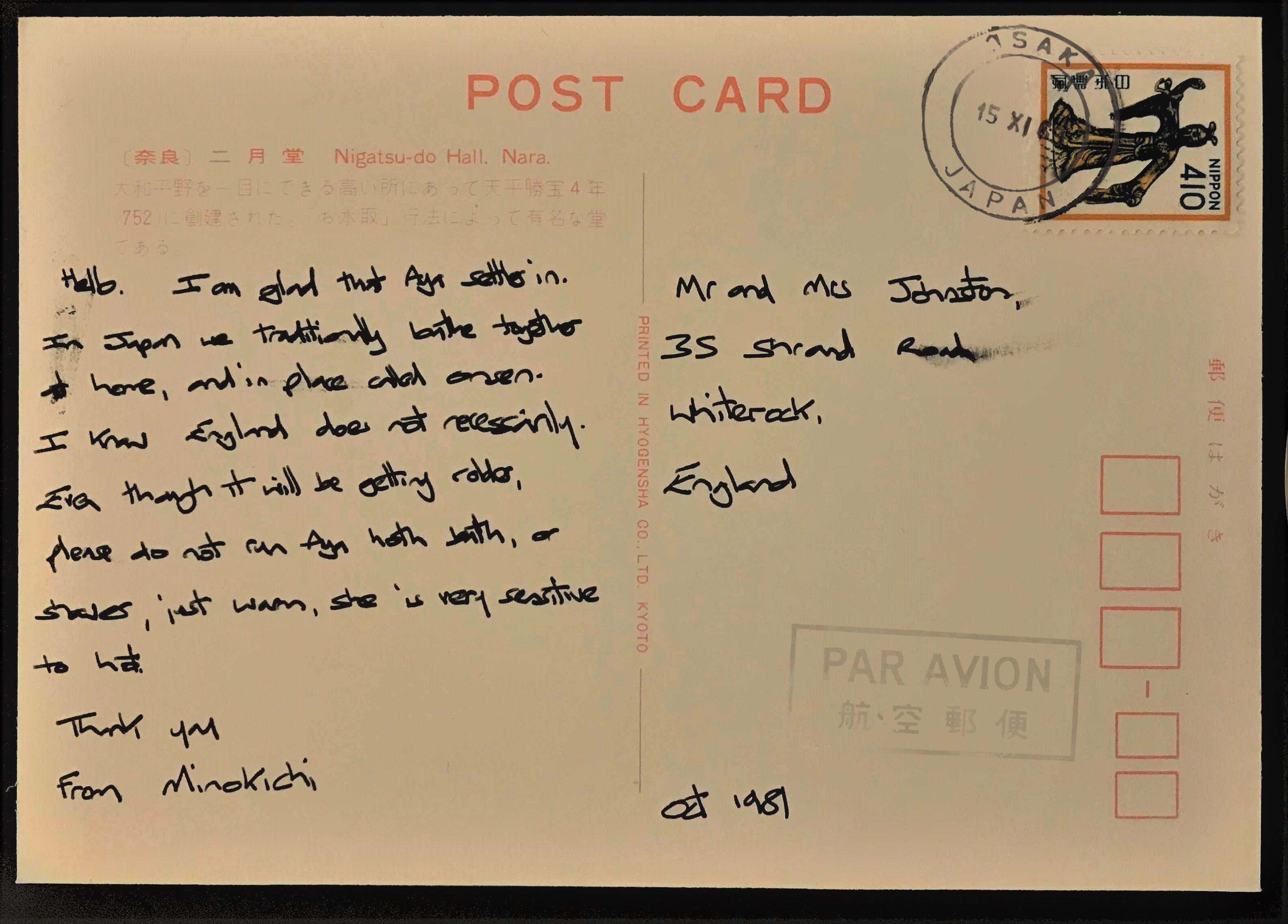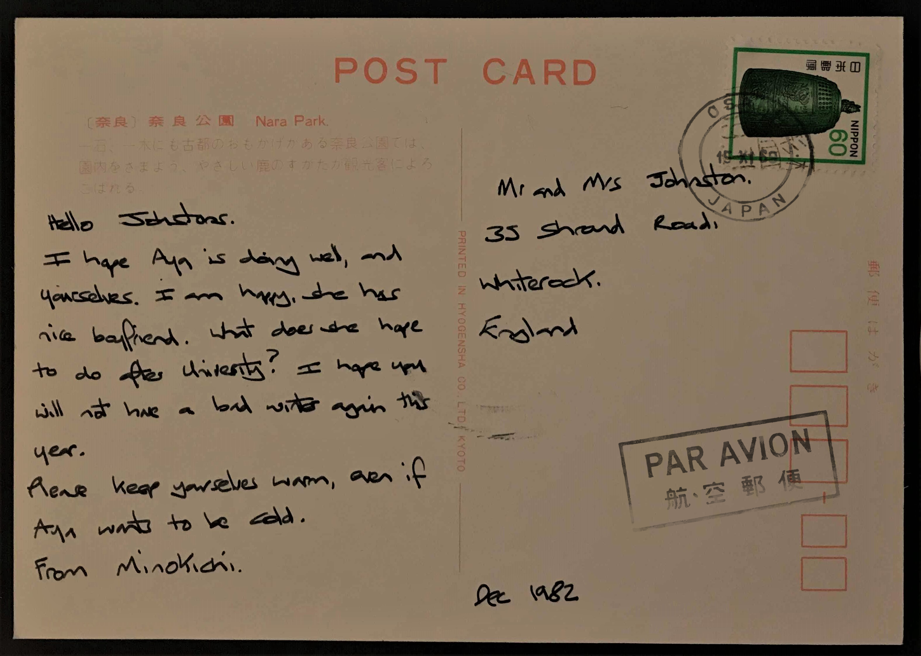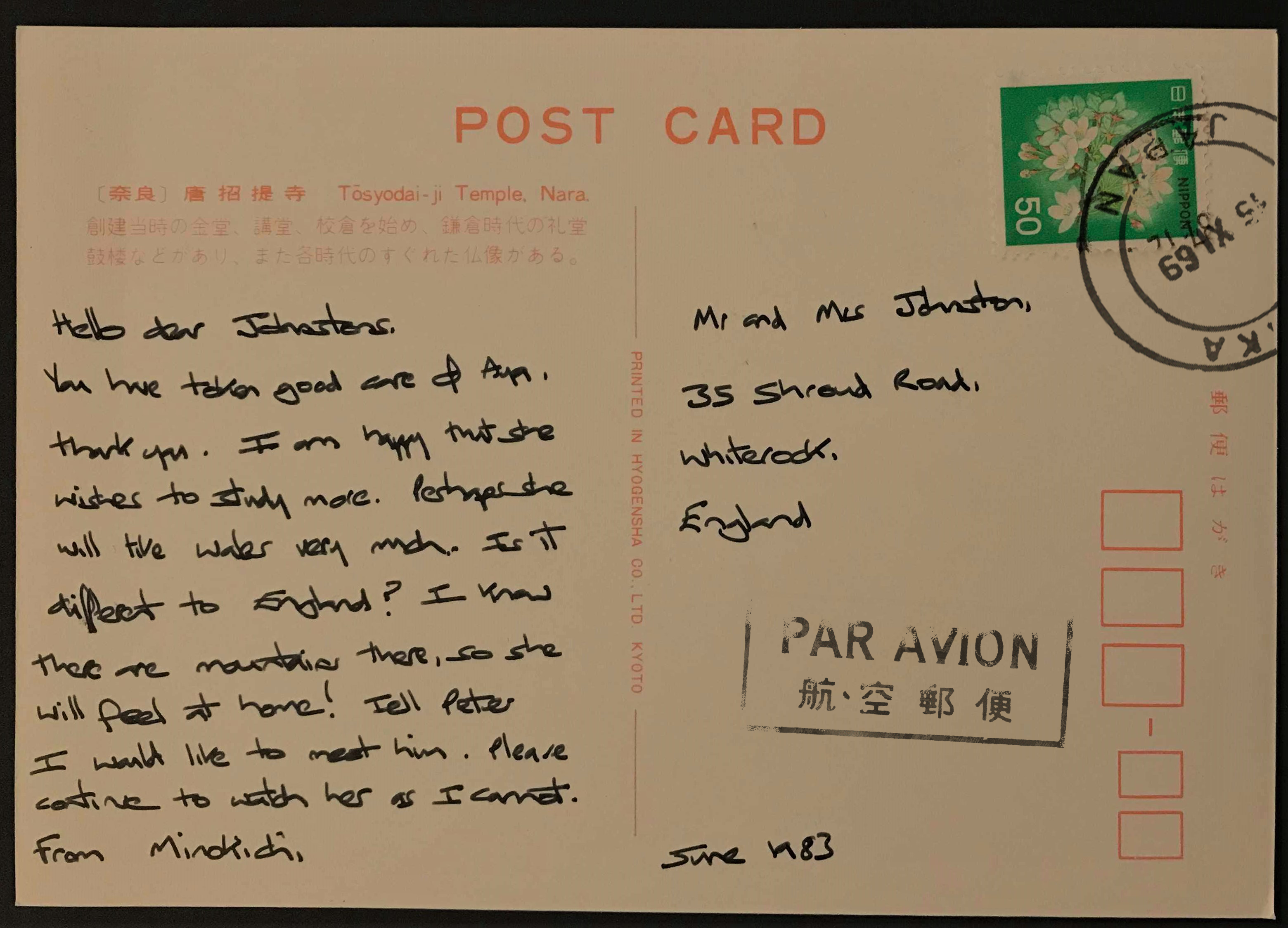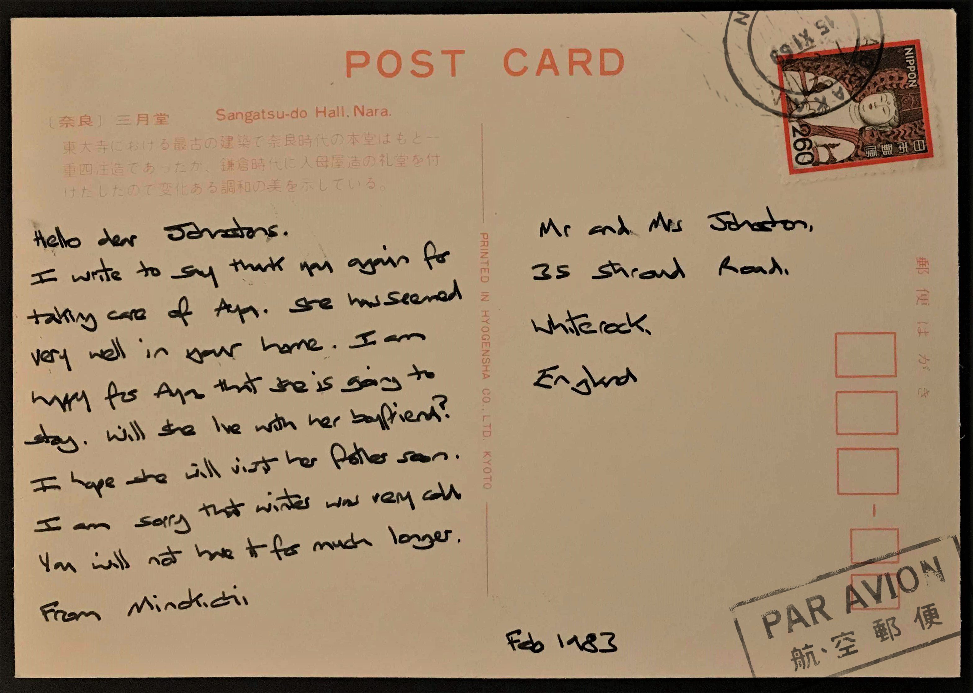 This particular card appears to have been written about a month after Aya had decided to live with Peter. Indeed, she told me she had left the Johnstons house, but I did not realise she left so abruptly. What do you think? Perhaps her father was simply feeling very worried, or perhaps the sentiment was lost in translation. I think I may have to talk to Aya again. I will send her an email.