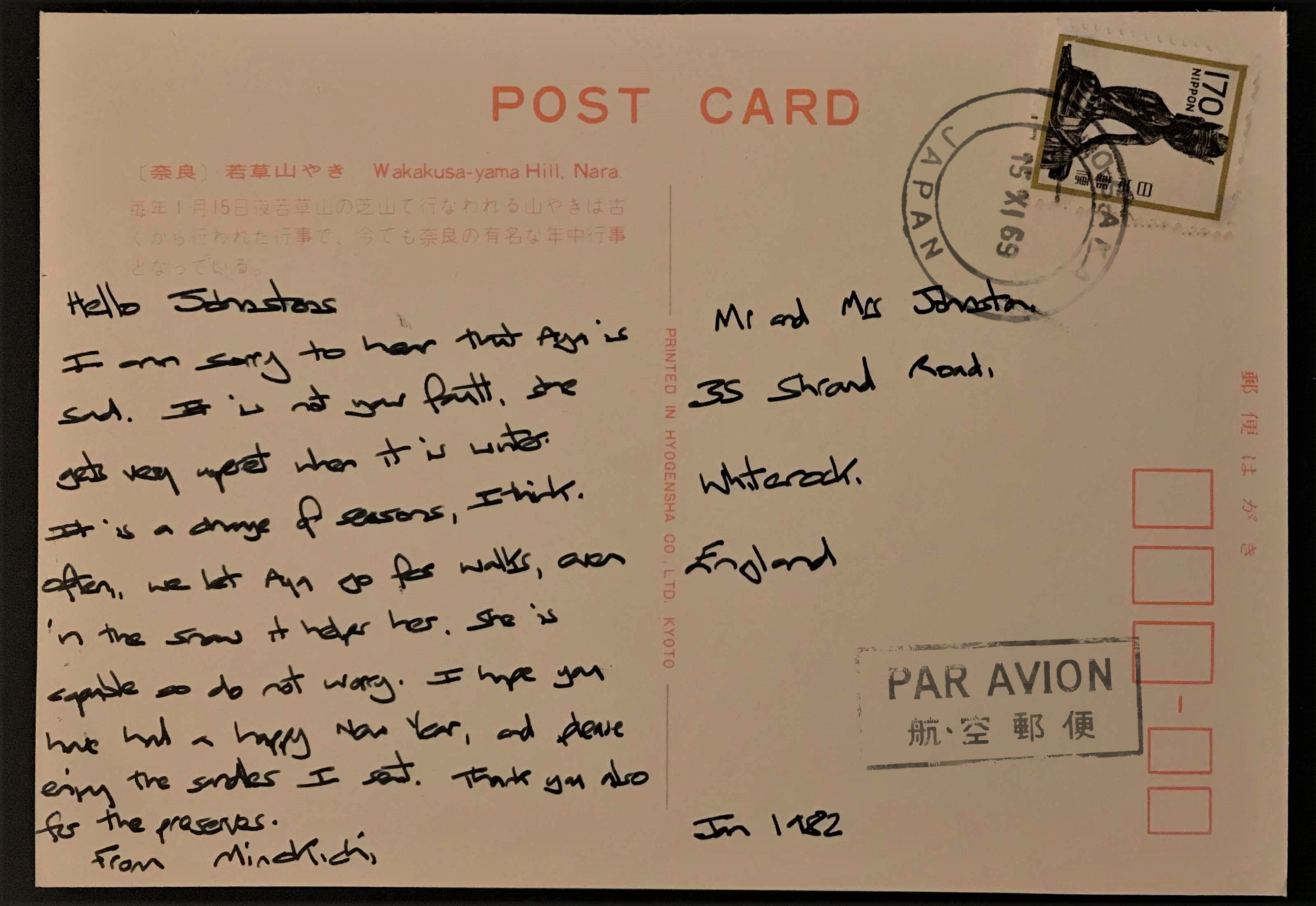 ‘Hello Johnstons. I am sorry to hear that Aya is sad. It is not your fault, she gets very upset when it is winter. It is a change of seasons, I think. Often, we let Aya go for walks, even in the snow it helps her. She is capable so do not worry. I hope you have had a happy new year, and please enjoy the sandals I sent. Thank you also for the preserves.